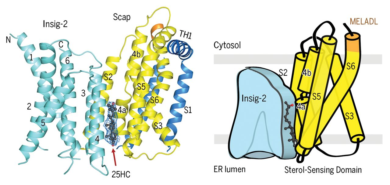 Cholesterol homeostasis is controlled by the SREBP (sterol regulatory element-binding protein) pathway. Key players in this pathway include SREBPs (SREBP1a, 1c and 2), Insigs (Insig1 and 2) and SCAP (SREBP cleavage activating protein). SREBPs are membrane-bound transcription factors that regulate the majority of genes related to intracellular cholesterol accumulation, and their activities are rigorously controlled by feedback mechanisms based on intracellular sterol levels. Briefly, when cells are depleted of sterols, SREBPs are translocated from the ER to Golgi apparatus under the escort of SCAP, undergoing a two-step proteolytic cleavage that releases N-terminal transcriptional domain. Conversely, when cells are replete with sterols, SCAP interacts with Insigs to retain SREBPs in the ER. The molecular details of how the SREBP-SCAP complex is regulated by Insigs and intracellular sterols have long been an enigma in this field.