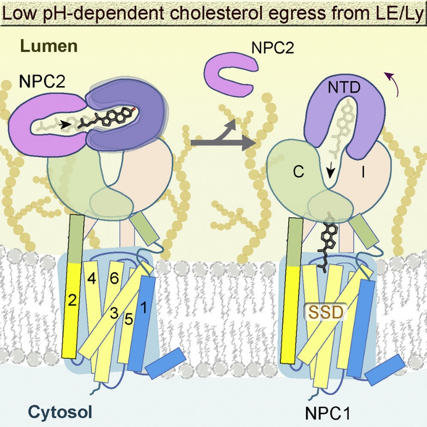 Niemann-Pick C1 (NPC1) and NPC2 cooperate to export LDL (low-density lipoprotein)-derived cholesterol from late endosomes and lysosomes to the other cellular compartments. NPC1 is a polytopic membrane protein located in the membrane of endosomes and lysosomes, while NPC2 is small soluble protein in the lumens. In 2016, we elucidated the cryo-EM structures of full-length human NPC1 and NPC1 in complex with the cleaved surface glycoprotein (GPcl) of the Ebola virus (EBOV), as NPC1 also mediates EBOV cellular entry. These structures help clarifythe mechanisms underlying NPC1-mediated intracellular cholesterol trafficking and EBOV infection (Cell. 165,1467-1478).