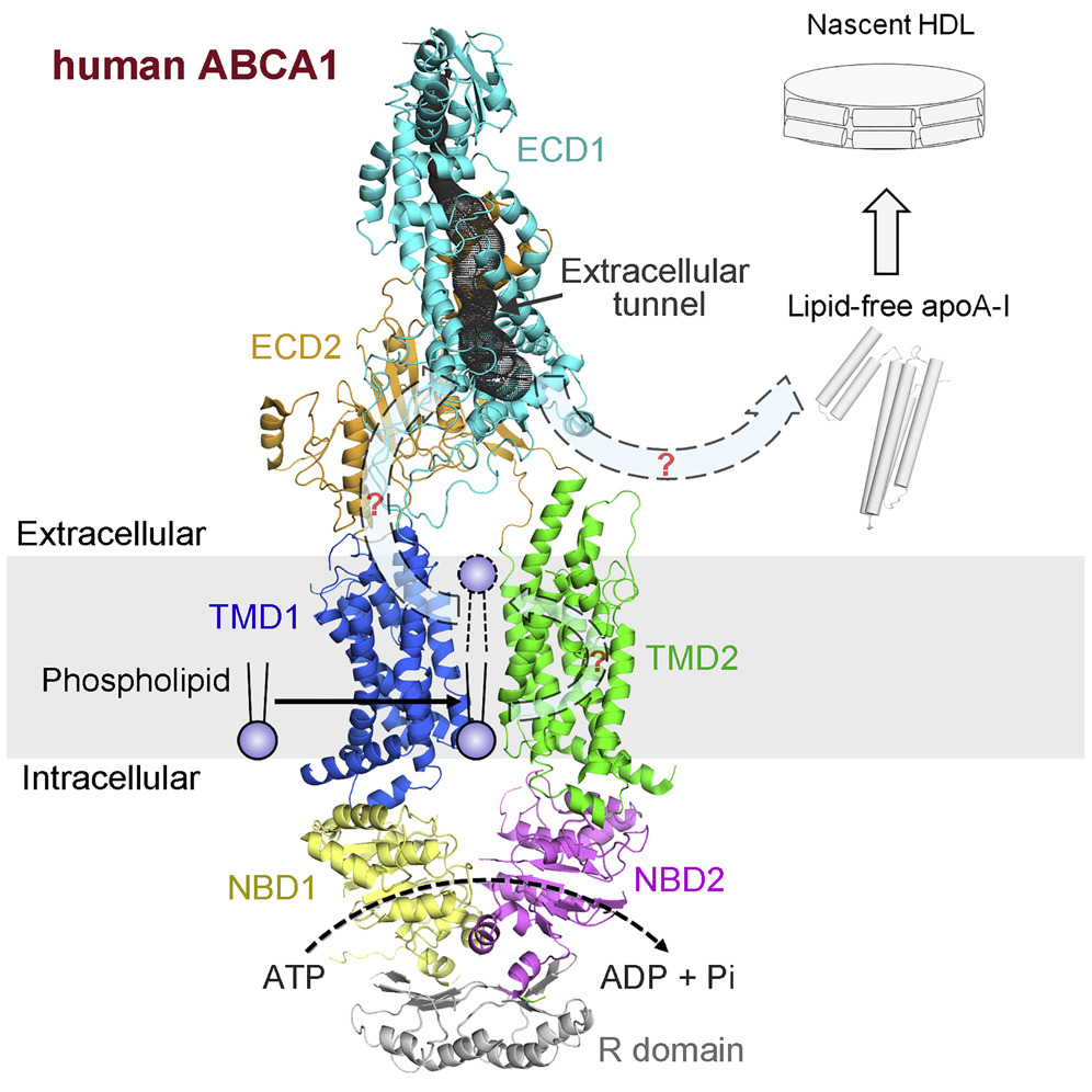ATP-binding cassette (ABC) superfamily A exporter mediates cellular efflux of phospholipids and cholesterol to the extracellular acceptor apoA-I for the generation of nascent high-density lipoprotein (HDL). Our cryo-EM structure of ABCA1 revealed that the transmembrane domain (TMD) of ABCA1 exhibits an “outward-facing”conformation, even in the absence of nucleotide, which is distinct from any other known structure of the nucleotide-free ABC exporters. This structure also suggests that pronounced conformational changes must occur for the substrates to be delivered from the membrane to the hydrophobic tunnel within the ECD (Cell. 169,1228-1239. 2017).