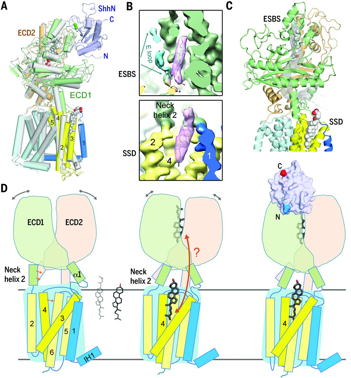 In our published cryo-EM structure of the Ptch1 and Ptch1-ShhN complex, we identified two steroid densities in both structures, one in the pocket enclosed by the extracellular domain (ECD) and the other in the membrane-facing cavity of sterol-sensing domain (SSD). Ptch1 undergoes steroid-induced conformational changes, and the binding of ShhN locks Ptch1 into a stable conformation (Science. 361, eaas8935. 2018).