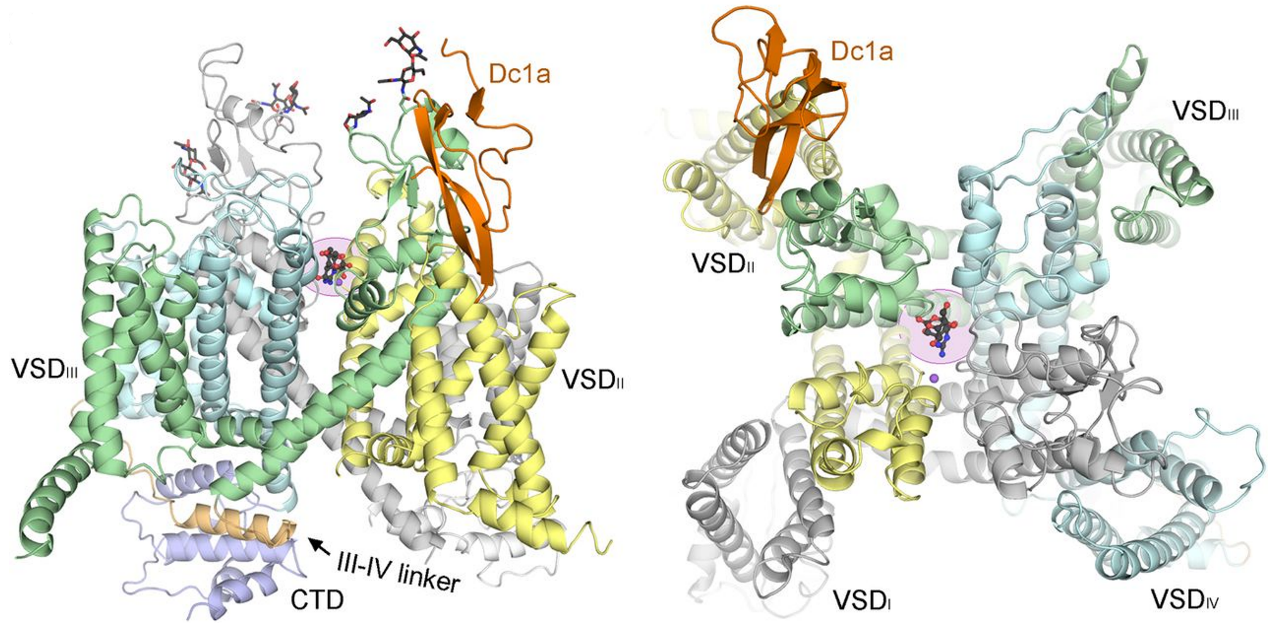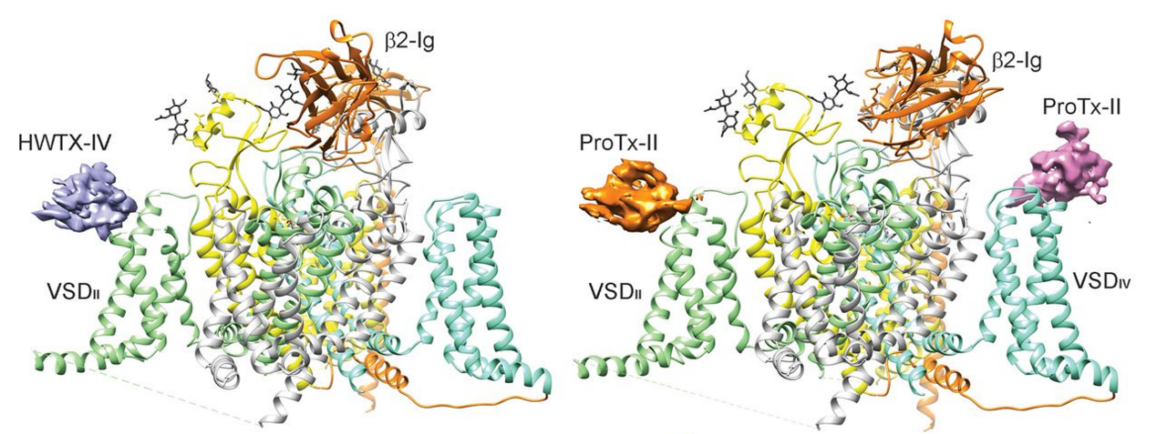 On Feb 9, 2017, we reported the cryo-EM structure of the eukaryotic voltage-gated sodium channel, NavPaS, at a resolution of 3.8 Å. It was the first eukaryotic Nav channel structure resolved at near-atomic resolution, and has laid the foundation for understanding its functional mechanisms and the pathogenesis of related diseases. The near-atomic structure provides the detailed architecture of NavPaS, allowing for side-chain assignments across the complete transmembrane fold, extracellular loops of the pore domain, the intact III-IV linker, and the carboxy-terminal domain (CTD). Animal toxins targeting on Nav channels can be broadly classified into two categories: pore blockers and gating modifiers. Thetetrodotoxin (TTX) and saxitoxin (STX) are classic pore blockers responsible for pufferfish and shellfish poisoning in humans, respectively. We reported the structures of the NavPaS bound to the gating modifier toxin Dc1a, both alone or in complex with TTX or STX, at resolutions of 2.8 Å, 2.6 Å and 3.2 Å, respectively. These structures reveal the molecular details of toxin binding and provide insights for the structure-based development of Nav channel drugs. [Science 355, eaal4326 (2017)] [Science 362, eaau2596 (2018)]