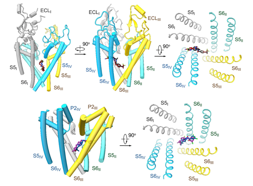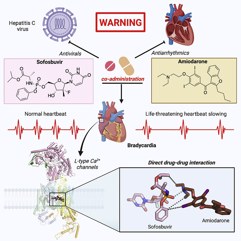 Drug-drug interaction (DDI) between the antiviral sofosbuvir (SOF) and the antiarrhythmics amiodarone (AMIO) has been reported to cause fatal slowing of the heartbeat. We present a systematic study of Cav1.1 and Cav1.3 treated with AMIO or SOF alone, or SOF/MNI-1 (analog of SOF) combined with AMIO. Through structural analysis, we found that AMIO alone occupies the DHP site, while SOF alone is not found in the channel. However, in the presence of AMIO, SOF/MNI-1 is anchored in the central cavity of the pore, directly blocking the ion permeation pathway. Our study reveals the molecular basis for the physical and pharmacodynamics interaction of DDI in Cav channels. [Cell 185, 4801-4810 (2022)]