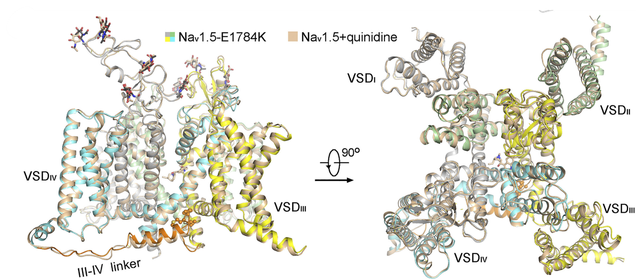 Nav1.5, encoded by SCN5A, is the primary Nav channel in the heart. Dysfunction of Nav1.5 is associated with several arrhythmia syndromes, exemplified by type 3 long QT syndrome (LQT3) and Brugada syndrome (BrS). We first determined the cryo-EM structure of Nav1.5 bound to quinidine at a resolution of 3.3 Å, revealing the molecular basis for the mechanism of action of Class Ia antiarrhythmic drugs. Immediately thereafter, we reported the cryo-EM structure of Nav1.5-E1784K, the most common variant associated with both LQT3 and BrS. From this structural analysis, we proposed a “door wedge” model to elucidate the mechanism of fast inactivation. Together with previous studies, the establishment of the structure-function relationship and understanding of the disease variants will facilitate the development of antiarrhythmic drugs. [Angew. Chem. Int. Ed. Engl. 60, 11474-11480 (2021)] [PNAS 118, e2100069118 (2021)]