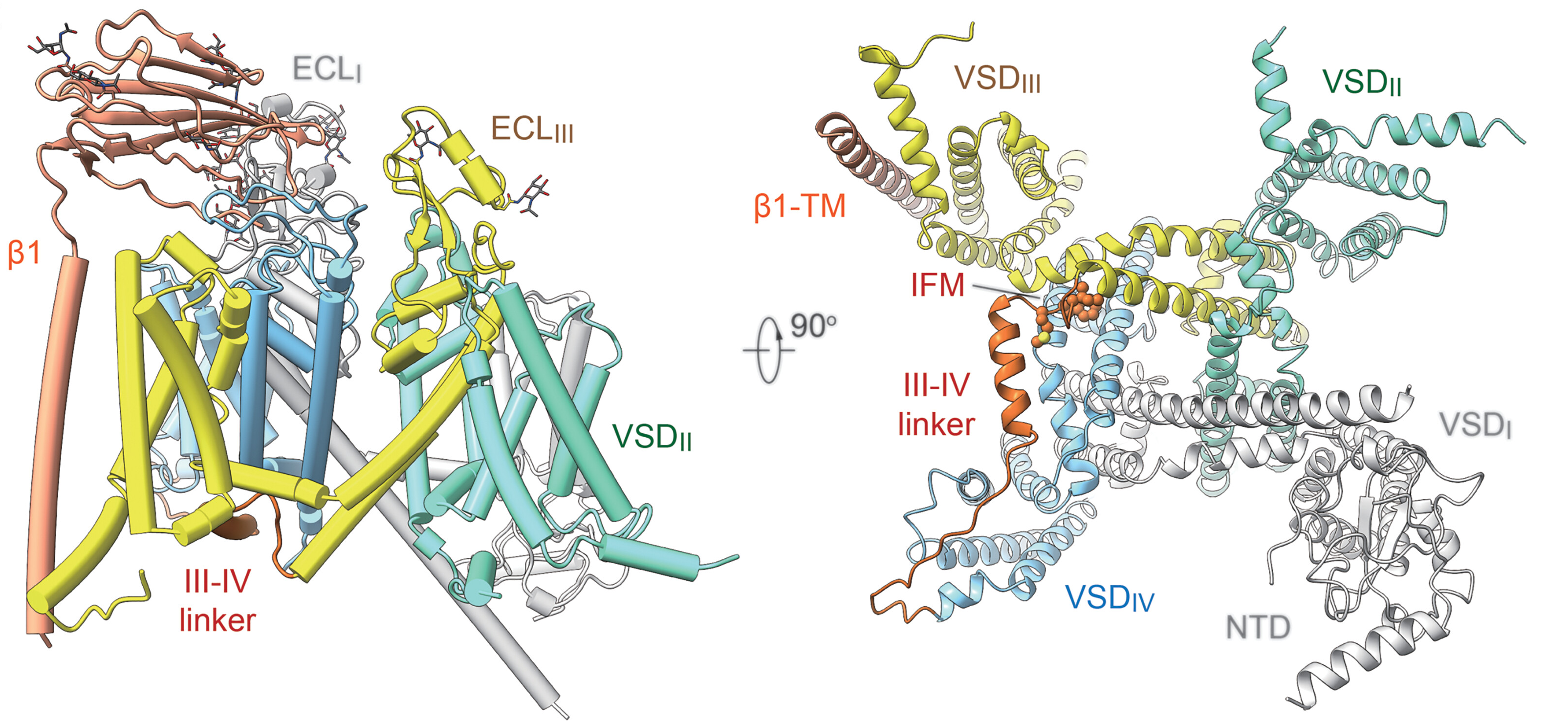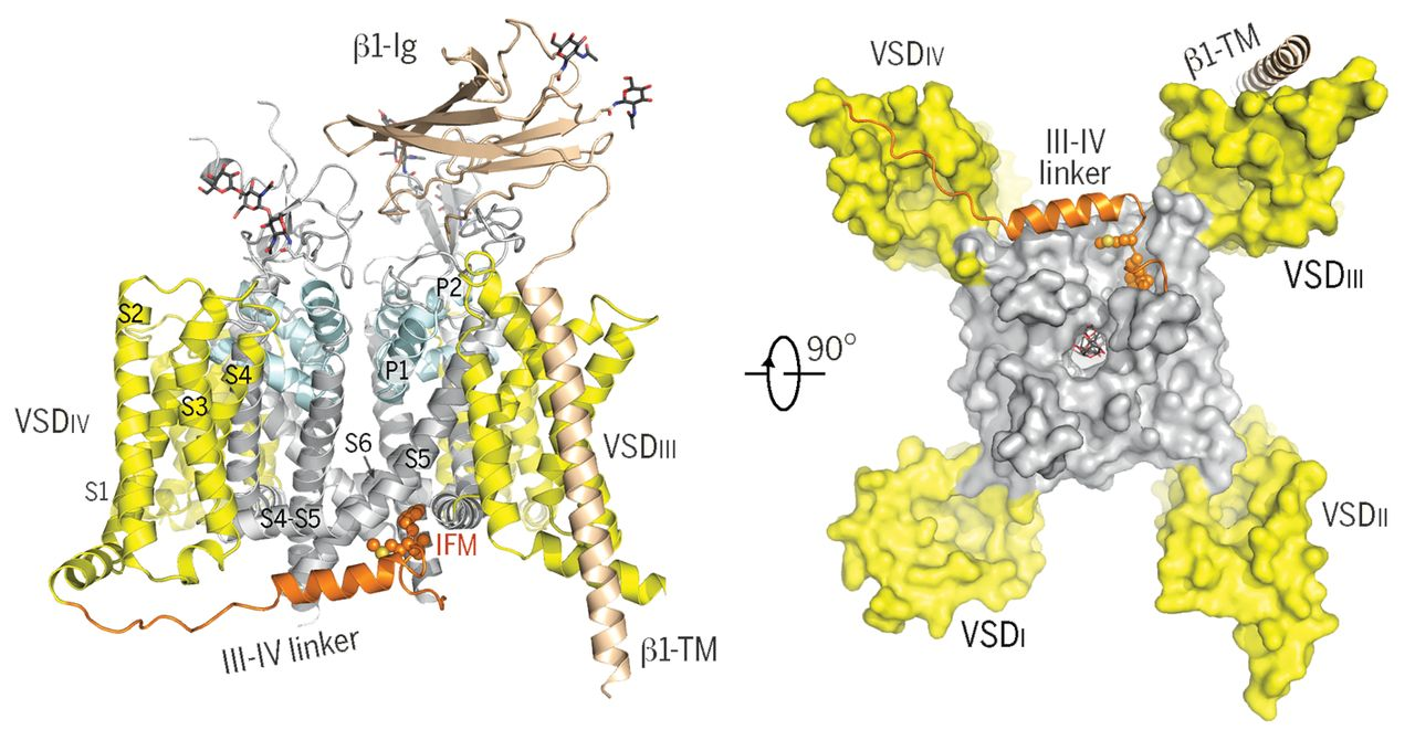Nav1.4, encoded by SCN4A in humans, functions in skeletal muscle. We firstly determined the cryo-EM structure of EeNav1.4, the Nav channel from electric eel, in complex with the β1 subunit at a resolution of 4.0 Å. With extensive effort, we subsequently solved the cryo–EM structure of the human Nav1.4 (hNav1.4)-β1 complex at a resolution of 3.2 Å. These two structures were nearly identical. Accurate model building of hNav1.4-β1 was done for the pore domain, the voltage-sensing domains, the fast inactivation motif, and the β1 subunit, providing insight into the molecular basis for Na+ permeation and the kinetic asymmetry of the four repeats. Structural analysis of reported functional residues and disease mutations corroborates an allosteric blocking mechanism for the fast inactivation of Nav channels. [Cell 170, 470-482 (2017), Science 362, eaau2486 (2018)]