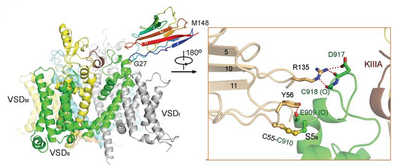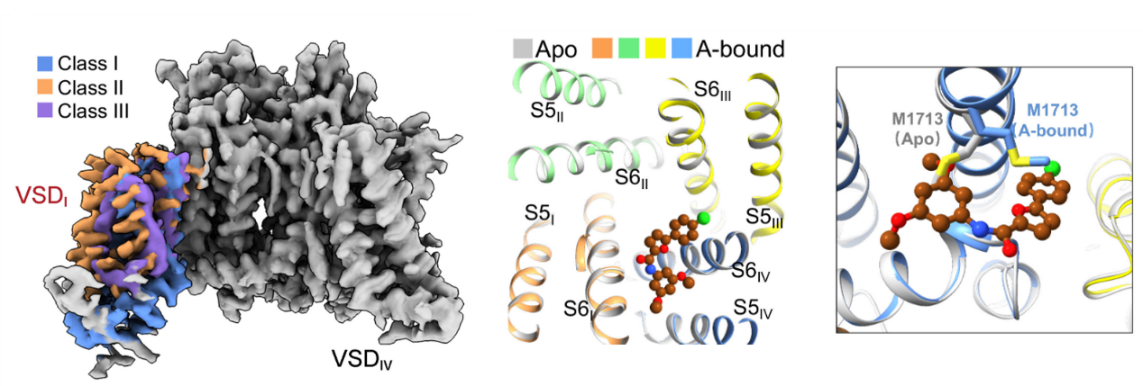 Cryo-EM structures of human Nav1.8 alone and bound to A-803467, a selective pore blocker, have been reported. Different conformations of VSDI were observed in Nav1.8. An extracellular interface between VSDI and the pore domain was determined, highlighting its dependence on higher voltage for activation. A-803467 clenched S6IV within the central cavity. Unexpectedly, channel selectivity for A-803467 was determined by non-ligand coordinating residues through an allosteric mechanism. [PNAS 119, e2208211119 (2022)]