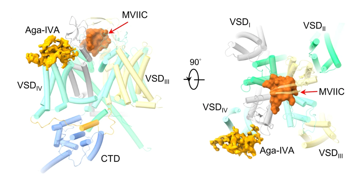 The P/Q-type Cav channels Cav2.1, encoded by CACNA1A and prevalently found in neurons and neuroendocrine cells, play a vital role in the release of neurotransmitters and the regulation of synaptic plasticity and neuronal excitability. Cav2.1 presents a potential therapeutic target for treating neurological disorders, such as epilepsy and migraine. Our work on Cav2.1 channel reveals the molecular mechanism of subtype-specific blockade of Cav2.1 by MVIIC and Aga-IVA, affords the structural interpretation for the distinct responses of the P- and Q-type Cav2.1 channels to Aga-IVA, and provides insight into the development of more efficient and selective modulators for the treatment of neuronal disorders. [Cell Res 34, 455-457 (2024)]